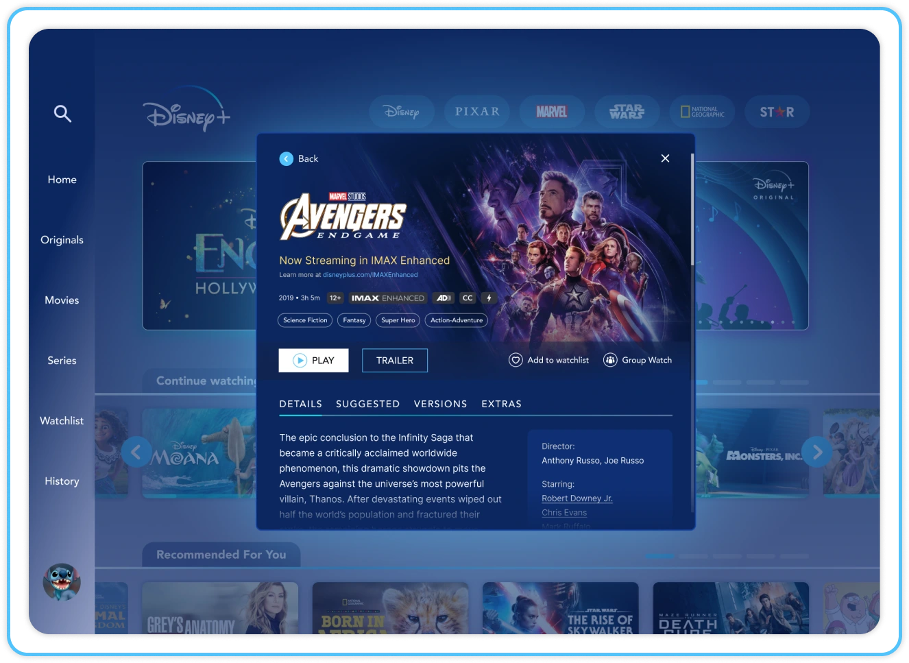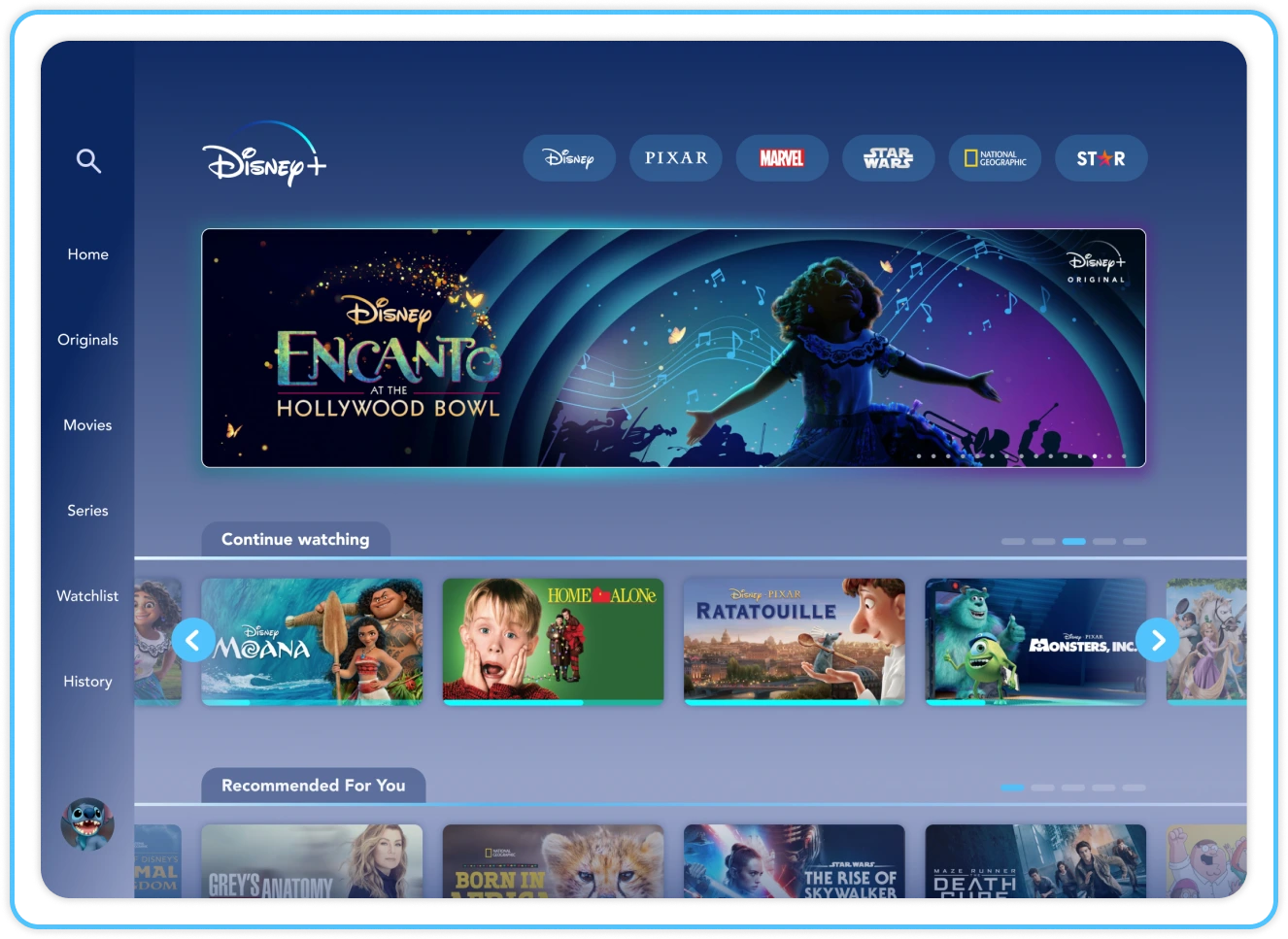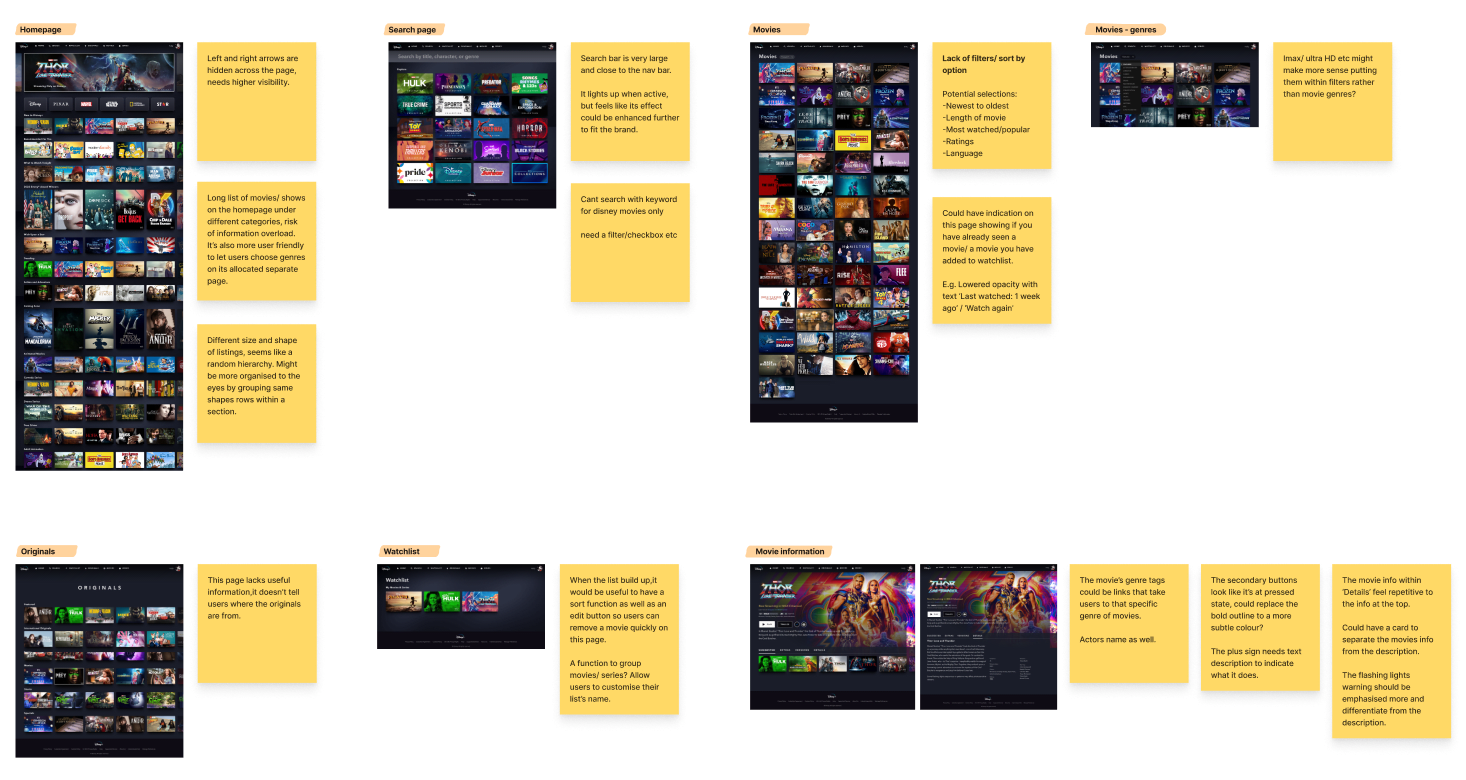 The ‘Continue watching’ row should be prioritised first so users can easily see where they left off previously. ‘Recommended for you’ / ‘New to Disney’ / ‘Because you watched ____’ can then come after. I’ve removed all the genres that are currently listed on the homepage as it can be too cluttered and unnecessary since users can easily access them on the movies/ series page or simply run a search.