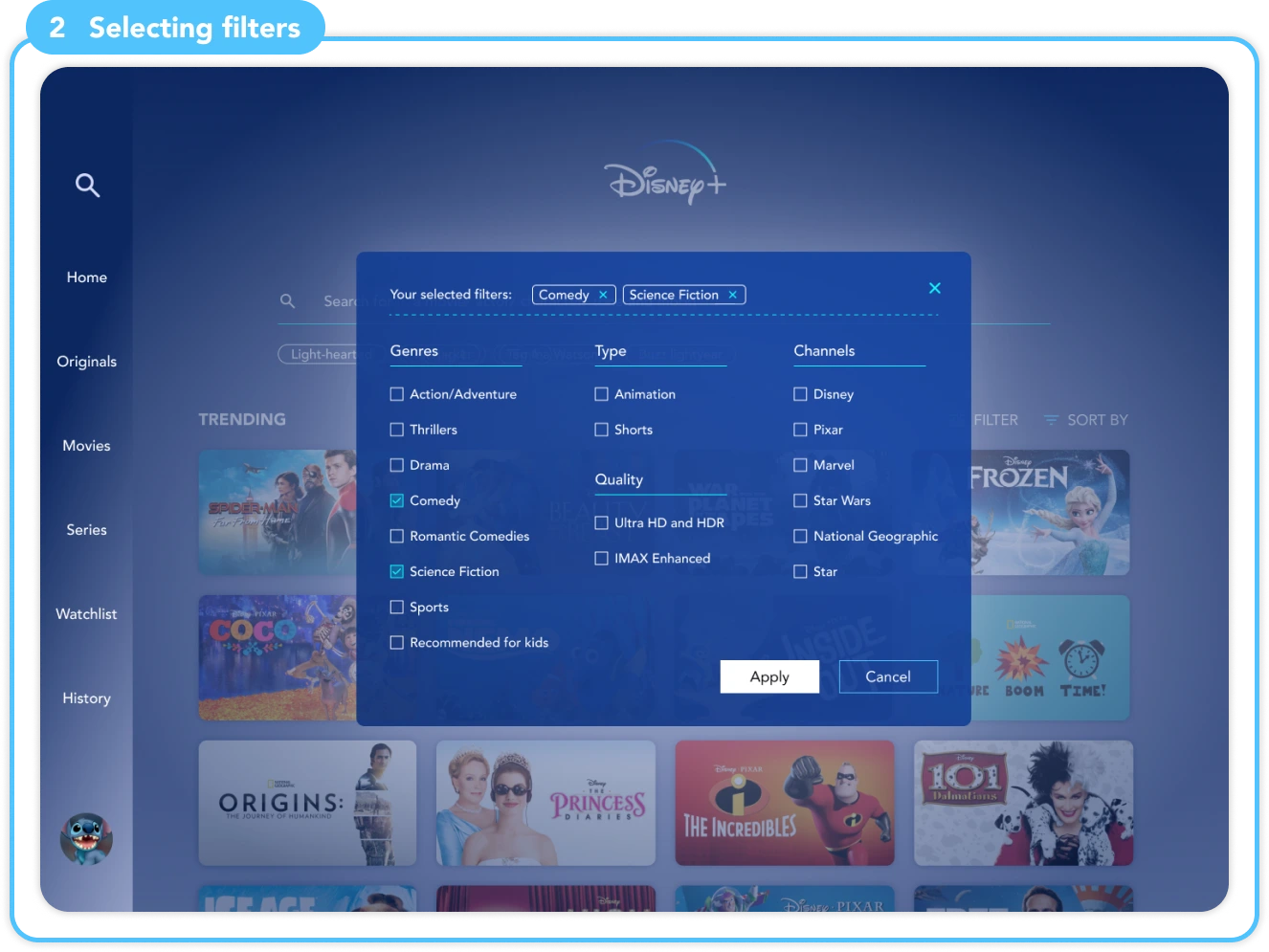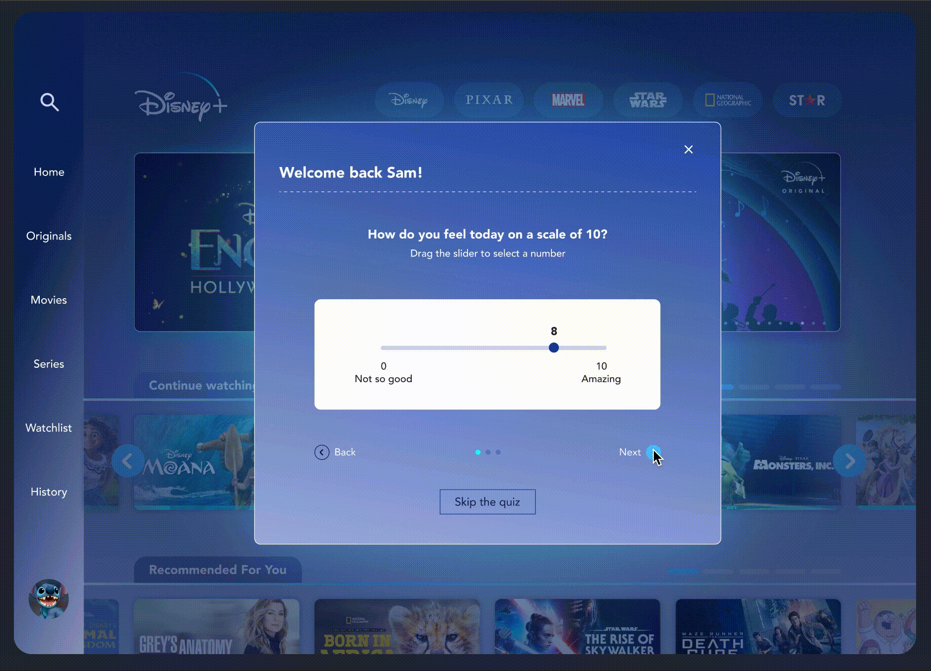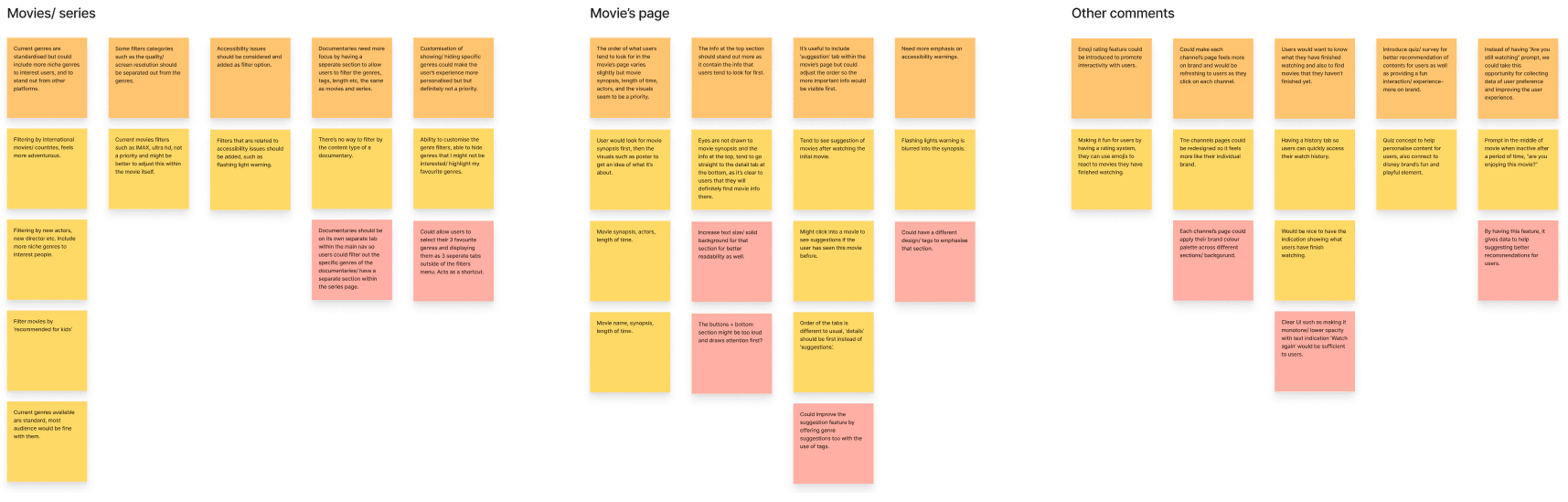 The ‘Continue watching’ row should be prioritised first so users can easily see where they left off previously. ‘Recommended for you’ / ‘New to Disney’ / ‘Because you watched ____’ can then come after. I’ve removed all the genres that are currently listed on the homepage as it can be too cluttered and unnecessary since users can easily access them on the movies/ series page or simply run a search.