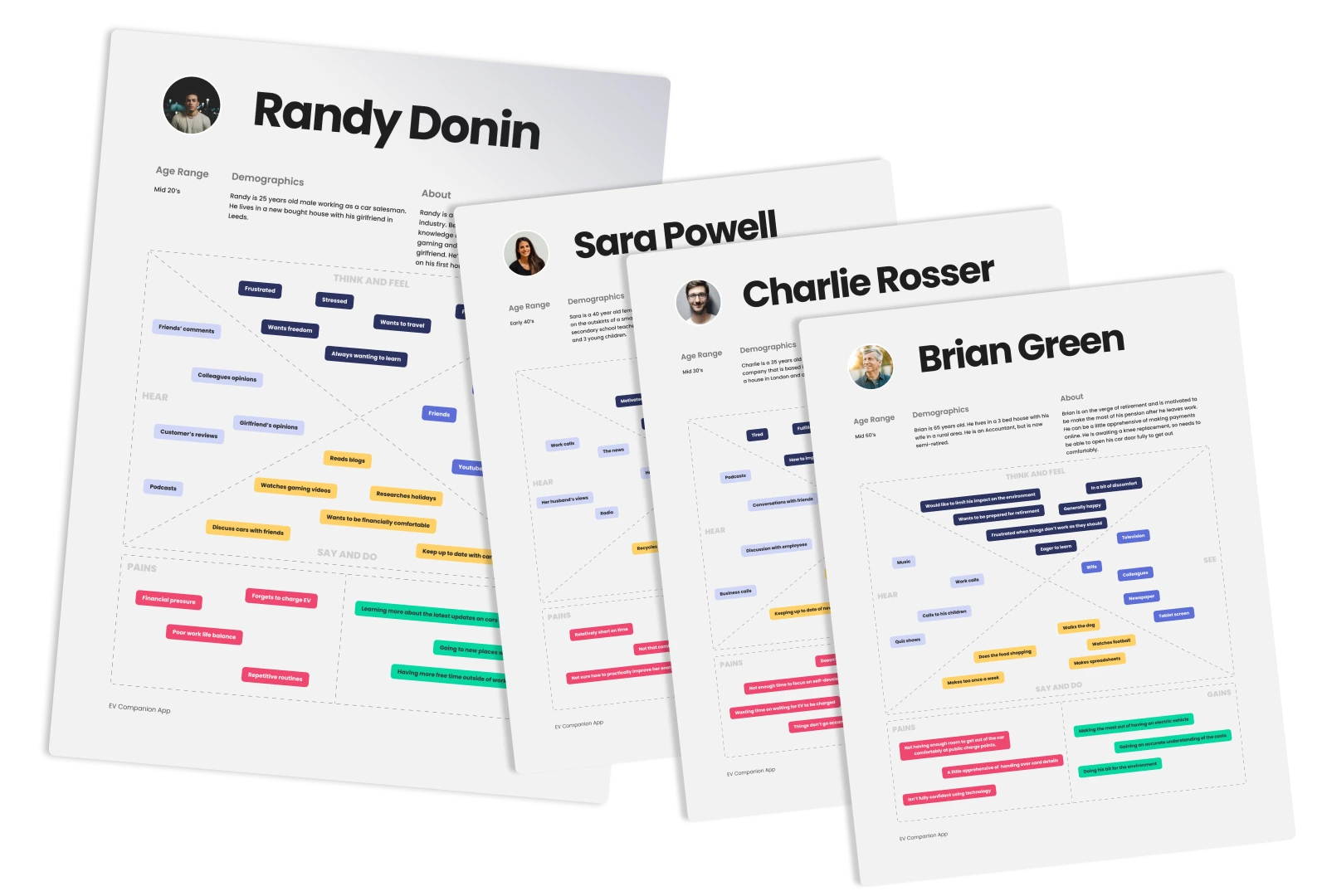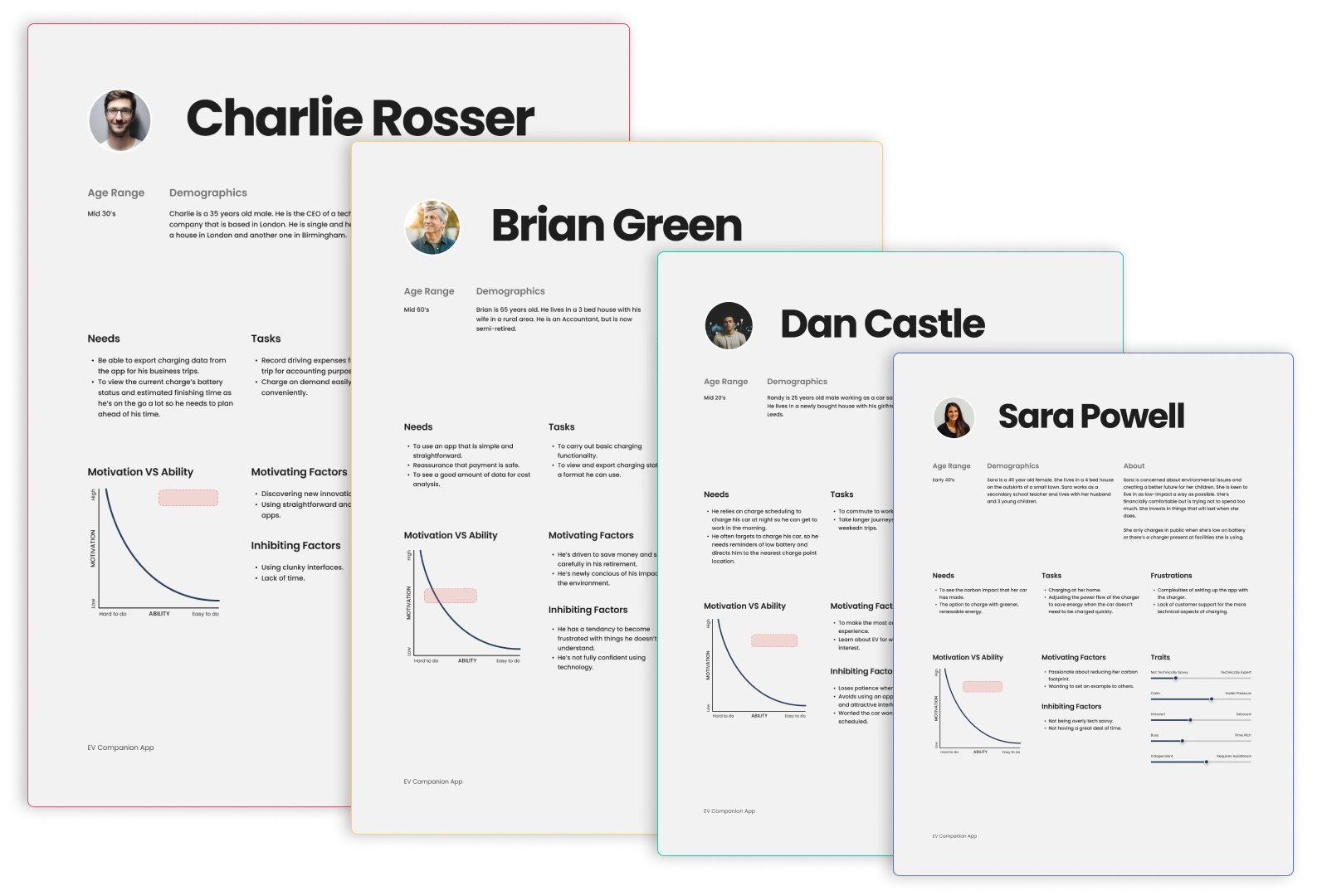 Using all the research we have done, we began to paint the picture of the user types and demographics through user personas. We focused on gaining a deeper understanding of the users such as their needs, goals, motivations, pain points.